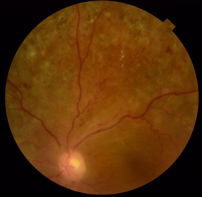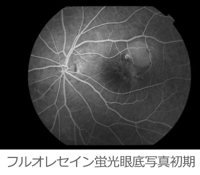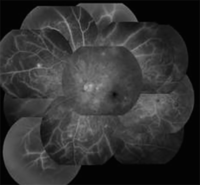 造影剤で中心から外れた部分が造影剤がまったく届かず、血管以外黒く抜けてみえます。中心部は比較的正常に近いので自分ではおかしくないようにみえるのですが、気づかないうちに悪化している症例です。こういう症例では網膜光凝固しておき、網膜を間引きしておく方が失明から遠ざかります。