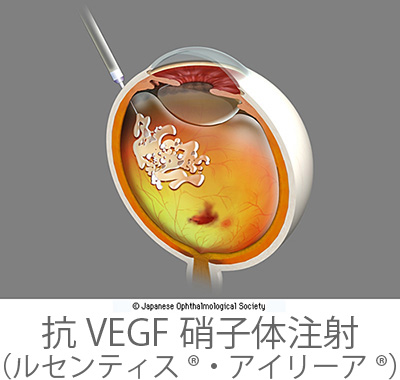 抗VEGF薬は脈絡膜新生血管の成長に影響するVEGF(血管内皮増殖因子)という物質の働きを抑える薬です。