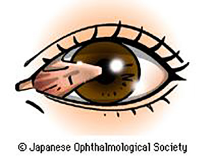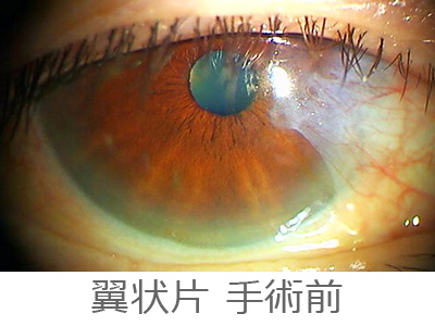 翼状片は、紫外線を良く浴びる人(例えば野外での作業が多い方)の黒目の内側から結膜(白目)増殖して入って来る病気です。